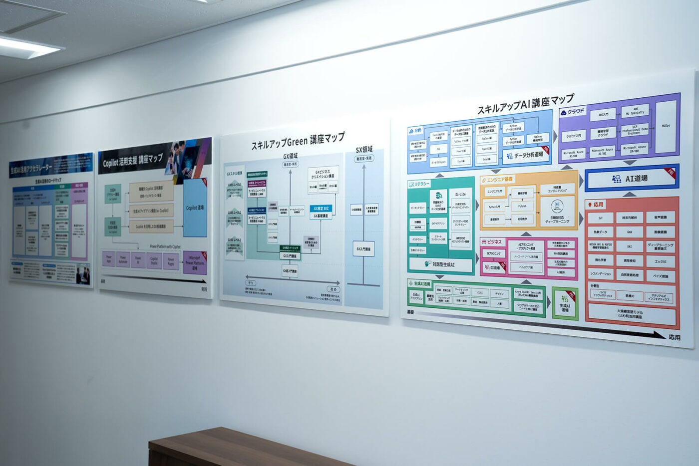 フロアの壁には、当社のサービス概要を掲示しています。お客様の来訪時に、お待ちいただく時に目に止めていただいたり、サービスについて説明できるようにしたり、工夫をしています。