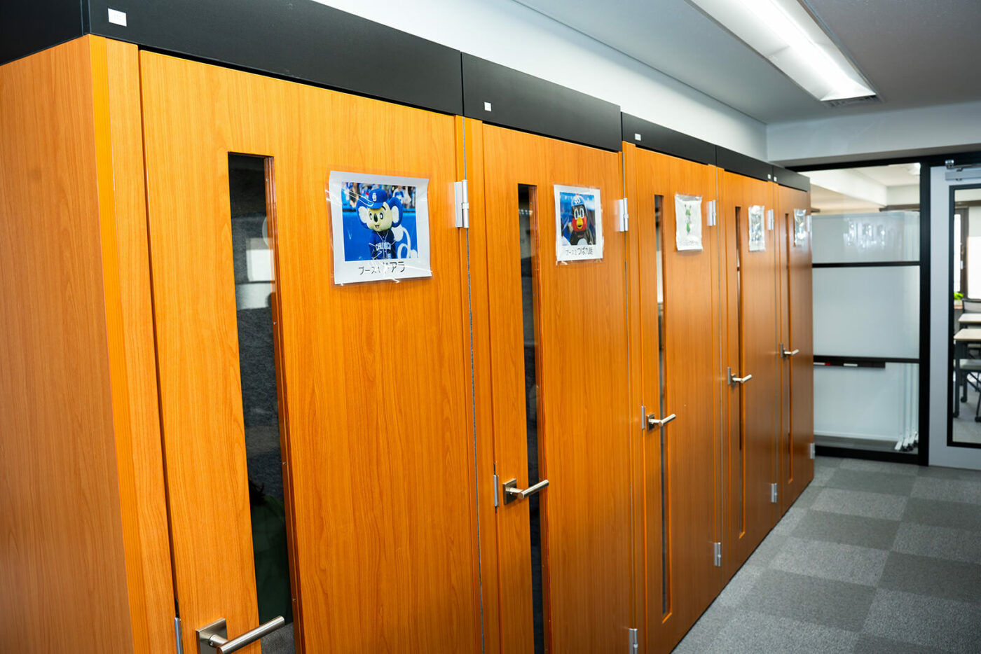 オンライン商談や会議の際に利用できる個室ブースを6つ設置。ブース名は「ドアラ」や「つば九郎」「ふっかちゃん」など、創業時からなぜかゆるキャラで統一されています(笑)。