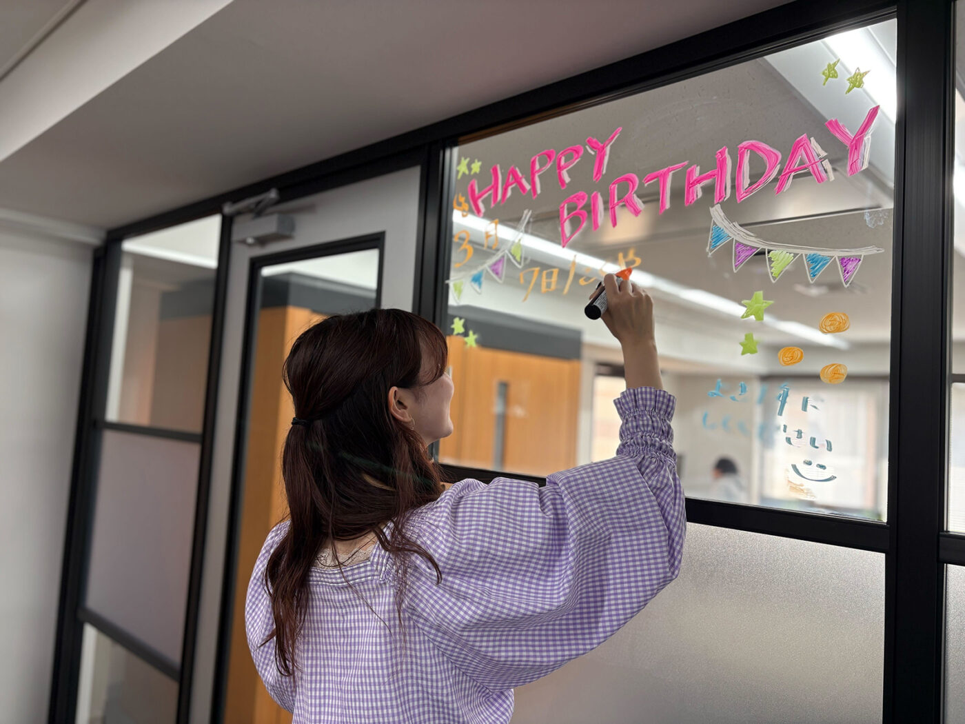 当社では、誕生日をお祝いする文化があり、毎月お誕生日の方をクリアボードに描いてお祝いしています。